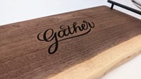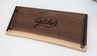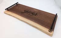 This beautiful board is solid black walnut with hardware. Photos show some handle options available.